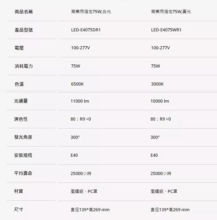 【文成】舞光燈具-商業用燈泡 E40 75W 全電壓(100V~240V) 白光 黃光