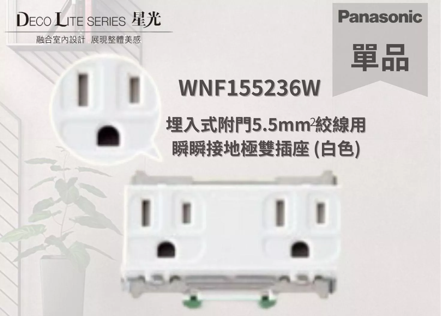 國際牌星光系列單品 WNF155236W 埋入式附門5.5mm 絞線用 瞬瞬接地極雙插座 (白色)