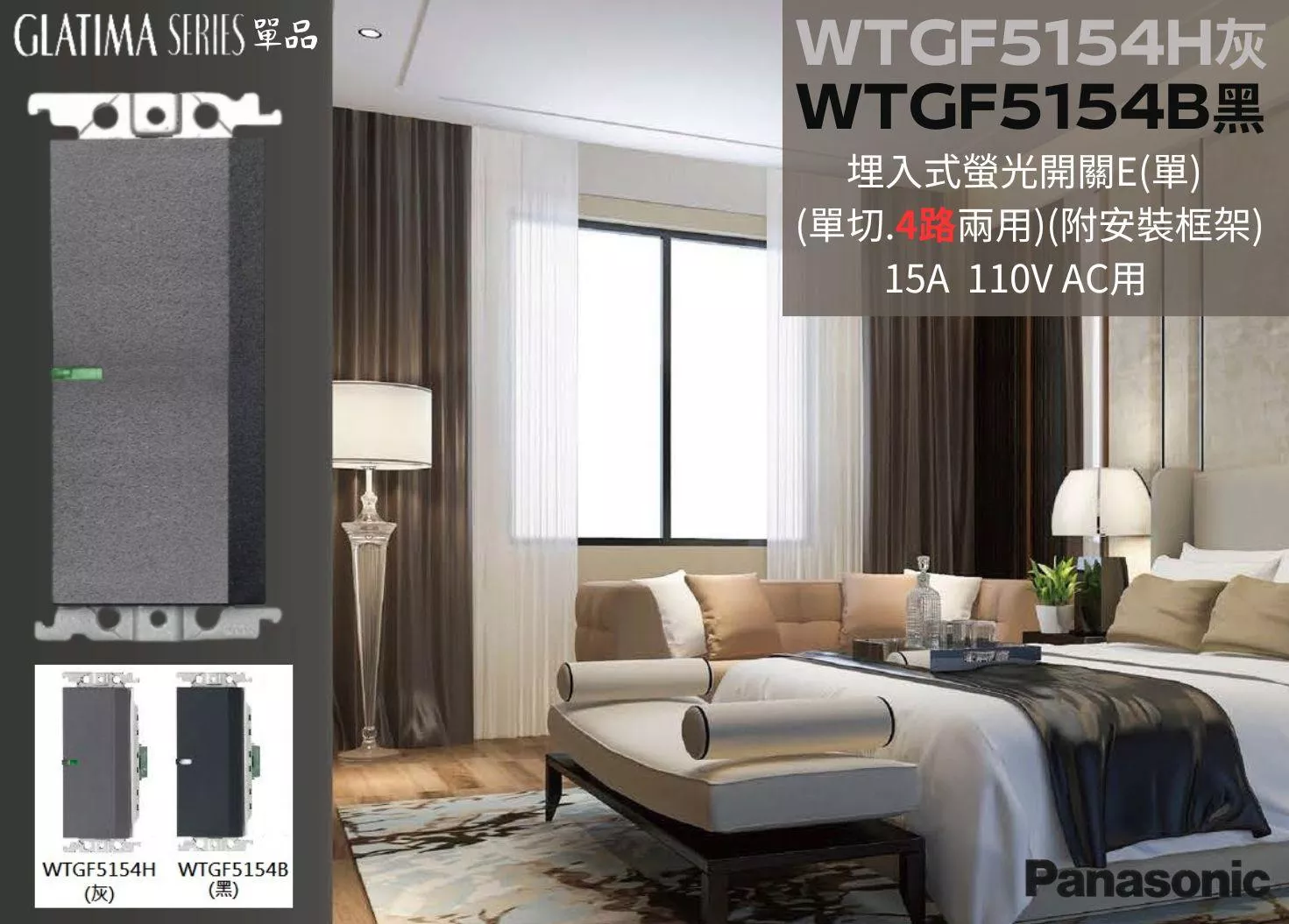 【文成】國際牌GLATIMA系列單品 埋入式螢光開關 WTGF5154H灰/WTGF5154B黑 一開附安裝框架 單切+4路兩用