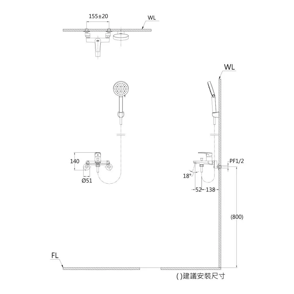 配件:沐浴龍頭,3段式蓮蓬頭,5尺防纏軟管。