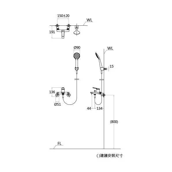 配件:沐浴龍頭,單段式蓮蓬頭,5尺防纏軟管。