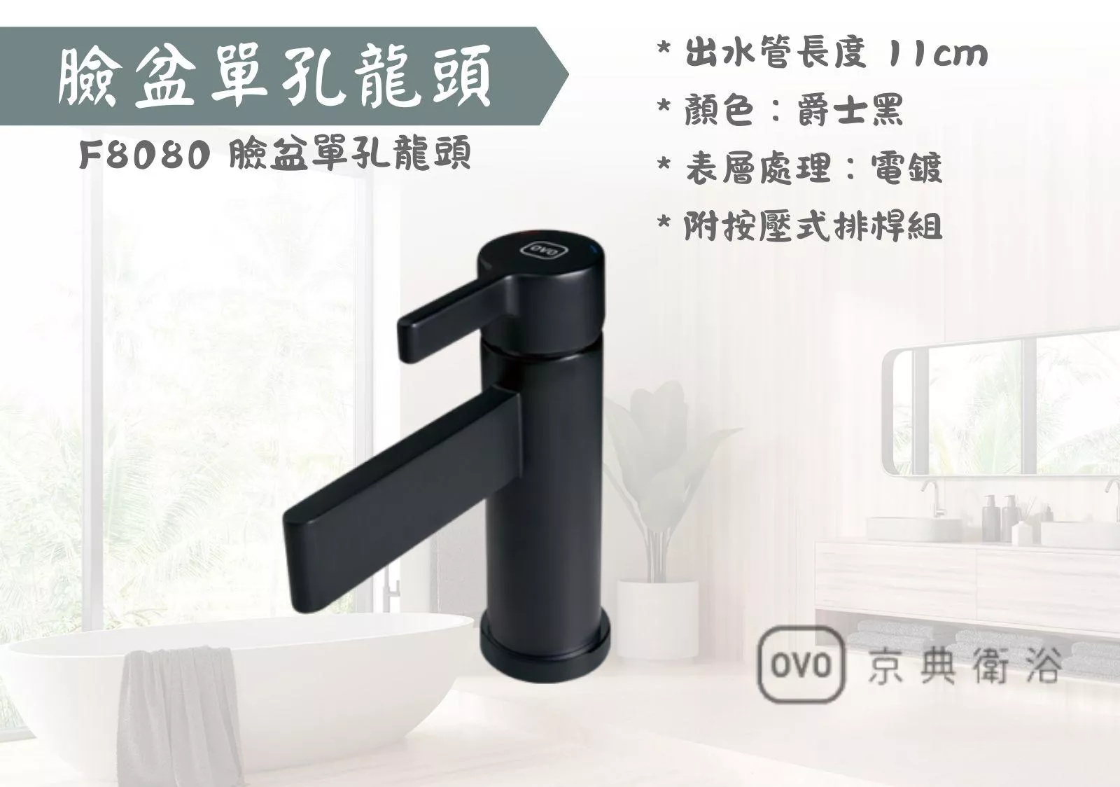 *出水管長度 11cm*顏色:爵士黑*表層處理:電鍍*附按壓式排桿組*龍頭主體無拉桿孔,不適用拉桿式排桿組